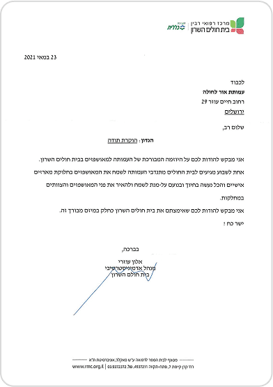 I would like to express my gratitude for the blessed initiative of your organization for the patients at Sharon Hospital.