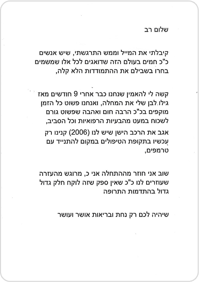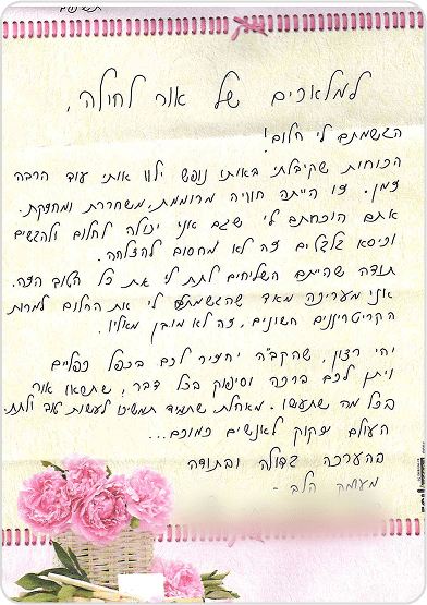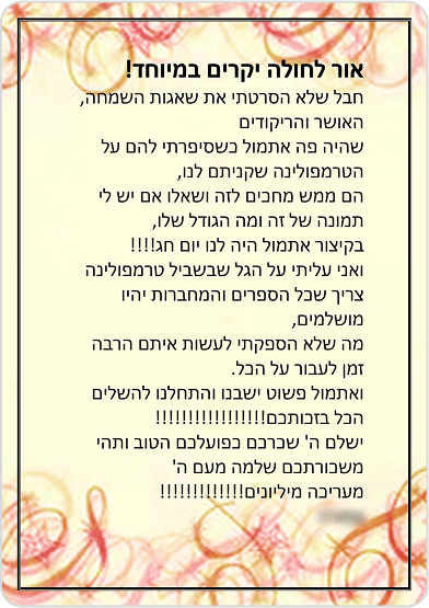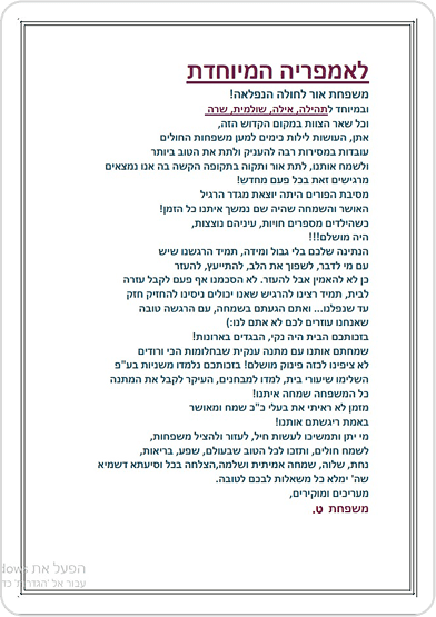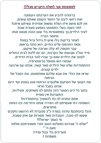 I haven’t seen my husband so happy and content in a long time—you really moved us. May you continue to succeed, to help and save families, to bring joy to the sick, and may you merit all the goodness in the world: abundance, health, peace, true and complete happiness, success in everything, and Heavenly assistance. May Hashem fulfill all your good wishes for the better.