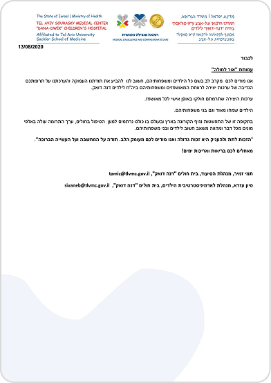 On behalf of all the children and their families, we deeply thank you and wish to express our heartfelt gratitude and appreciation for your generous donation of creative kits for the benefit of the patients and their families at Dana-Dwek Children’s Hospital.